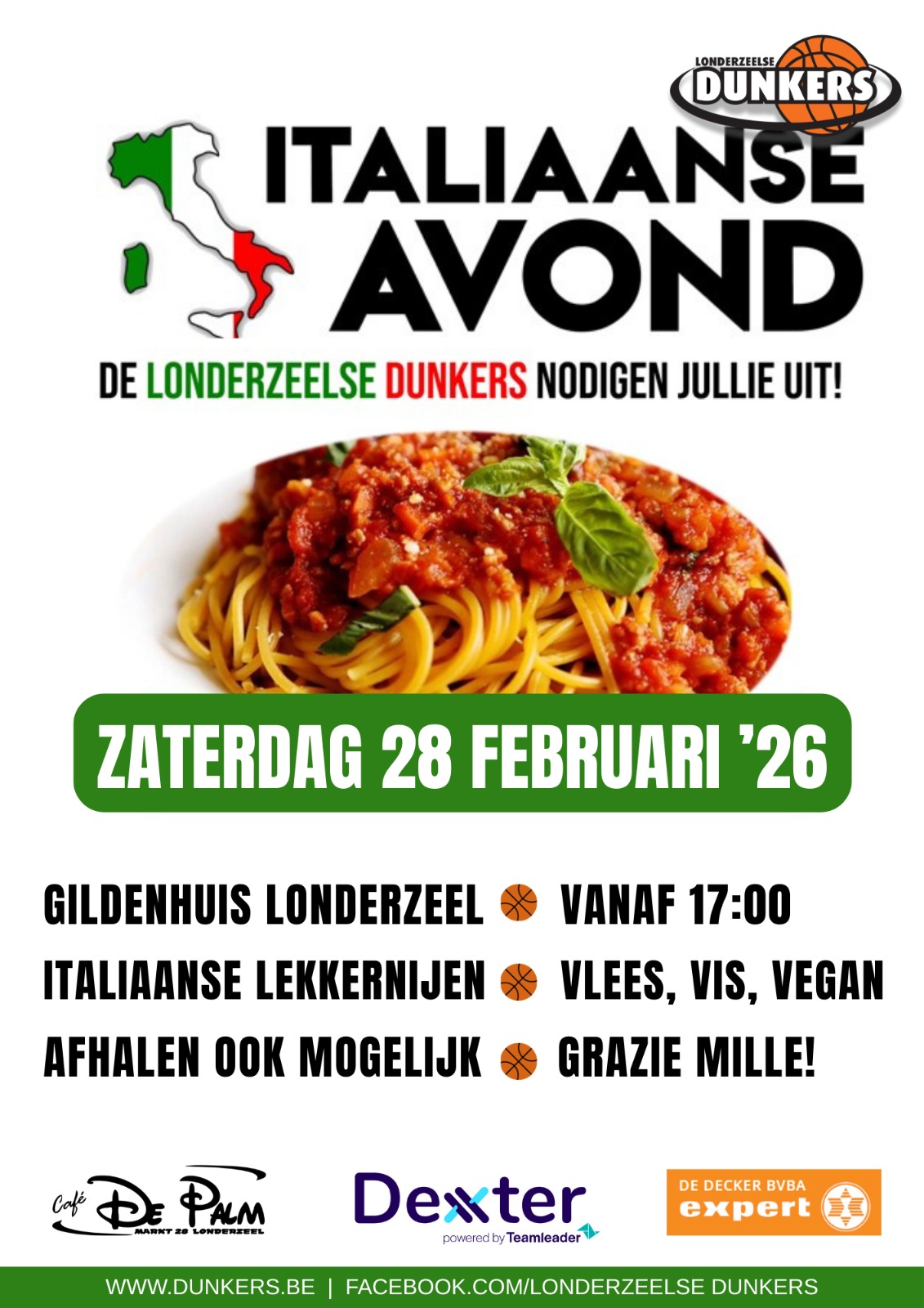 Geen Dunkers seizoen zonder Italiaanse Avond. Op zaterdag 28 Februari is er onze Italiaanse avond. Zoals bij de vorige edities zal je ook nu kunnen genieten van lekkere Italiaanse gerechten. Hou alvast die datum vrij. Wij rekenen op je komst zodat deze editie even succesvol wordt als de vorige. Dit gaat net zoals vorig jaar door in het Gildenhuis in Londerzeel!